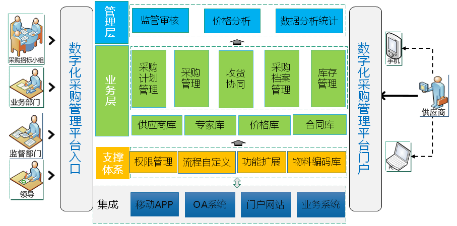 数字化采购管理平台以 “简洁、高效、规范、阳光”为目的,利用互联网、云计算、电子签章、远程加密等技术,建设一套专业服务于检测机构的采购和供应商管理平台,实现采购业务的智能化、协同化和平台化,做到依法采购、规范操作、提升效益、强化监管,最大限度降低在采购活动中的费用支出,实现对采购业务的事前审批、事中监管、事后核查的全采购流程管理。